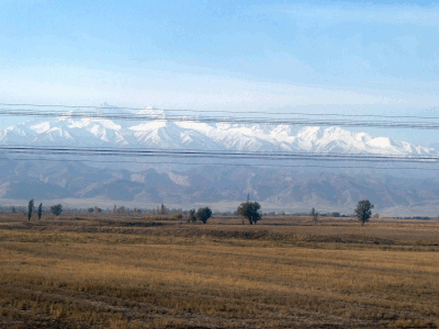 Das Frühstück entschädigt für die unruhige Nacht. Der Blick aus dem Zugfenster fällt auf staubige gelbliche Steppe, durchsetzt mit einzelnen Bäumen in bunten Herbstfarben und hohen Bergketten am Horizont. Richtige Berge. Zwischen vier- und fünftausend Meter hoch, gekrönt mit schneebedeckten Gipfeln. Ein erhebender Anblick. Auf der längsten Fahretappe, von Bischkek nach Samarkand, haben wir ausreichend Zeit dies zu bewundern, denn wir fahren über tausend Kilometer am Stück.