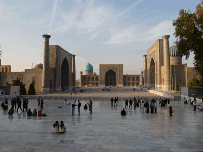 Ein absolutes Highlight der Reise ist Samarkand in Usbekistan, das wir am siebten Tag erreichen. Waren Kasachstan und Kirgisistan noch ziemlich sowjetisch geprägt und aus alten Nomadenvölkern hervorgegangen, so empfängt uns hier der Orient. Anders als Amaty und Bischkek, die aus Ansammlungen von Jurten (so heißen die kreisrunden Zelte dort) entstanden sind, ist Samarkand 2.500 Jahre alt. Auch wenn nach Dschingis Khans Mongolensturm im 13. Jahrhundert kaum noch ein Stein auf dem anderen geblieben ist. Der Hauptplatz von Samarkand, der Registan, ist eine Augenweide islamischer Architektur und zwischen dem 15. Und 17. Jahrhundert errichtet worden. Drei gewaltige Koranschulen umgeben ihn und schaffen dazwischen Platz für Gläubige und ungläubig staunende Touristen. Hier spürt man, dass diese Stadt lange das Zentrum islamischen Wissens in Zentralasiens gewesen ist.