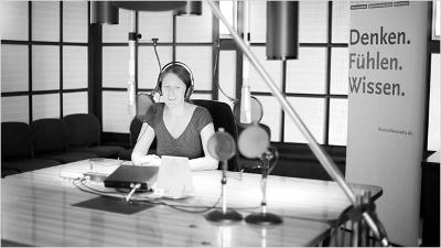 Sie verweilt in einem Tonstudio und spricht ins Mikrofon...