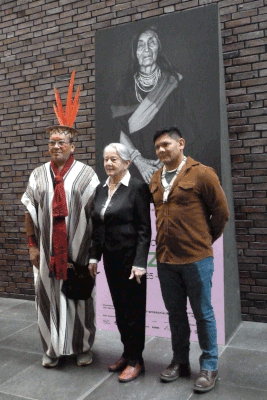 Francisco Piyãko (li.) Lélia Wanick-Salgado und Beto Marubo posieren im RJM vor den Porträtaufnahmen der Indigenen | © Helga Fitzner