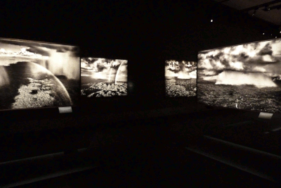 Die Salgados zeigen die überwältigende Schönheit des Regenwalds und die Lebensweise einiger Stämme, die bis dahin keinen Kontakt zur Außenwelt hatten. In der mehr oder weniger abgedunkelten großen Halle leuchten einige der riesigen Schwarz-Weiß-Bilder, und Wolken, Baumwipfel und Flusslandschaften scheinen im Raum zu schweben [s. Foto unten]. Es gibt kleinere Nischen, in denen die Porträtaufnahmen der Indigen zum Betrachten einladen mit Videoaufnahmen von Ältesten, die über das Leben der Bewohner und z.B. über die Auswirkungen der Brandrodungen und Abholzungen sprechen. Auf den Bildern sind auch Francisco Piyãko, Beto Marubo und ihre Familienmitglieder abgelichtet. Die Frau auf einem der Plakatmotive ist Piyãkos Tante Julieta. Er selbst ließ sich für die Pressefotografen auch vor diesen Fotos aufnehmen und hatte sich zu dem Anlass in ein traditionelles Gewand gehüllt.