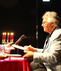 Martin Miller reicht im Aufbau-Haus Berlin gerade Jemandem sein handsigniertes Buch - Foto (C) Jamal Tuschick
