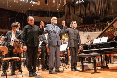 Pierre-Laurent Aimard, Helmut Lachenmann und Vladimir Jurowski (v.l.n.r.) nach dem RSB-Konzert mit Lachenmanns Ausklang - beim MUSIKFEST BERLIN 2025   Foto (C) Stefan Maria Rother