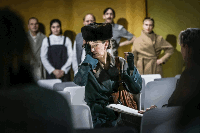 Das Publikum betritt nicht, wie üblich, den Zuschauerraum, sondern über einen Hintereingang eine ebenerdige große Drehbühne, die im Stückverlauf mehrmals bewegt und etwa gehoben oder gesenkt wird (Bühne: Andrea Wagner). Regisseurin Mina Salehpour lässt die Darsteller um die, auf zweihundert Drehstühlen platzierten Theaterbesucher herum und inmitten des Publikums agieren. Auf schlierige, die Bühne umgebende Gazevorhänge werden Filmszenen projiziert.
