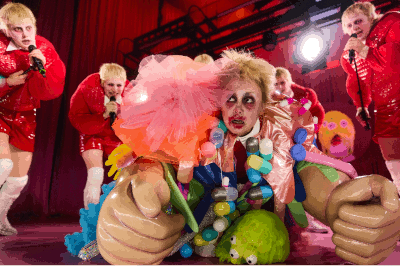 Der Thomas Melle der Stuttgarter Version und seine Doppelgänger sind für Lucia Bihler typische Kunstfguren mit Buckel in roter Latexkleidung und mit weißen Kniestrümpfen. Rosafarbene Vorhänge und Treppen mit Kitschappeal spielen mit. Lucia Bihler macht aus einem Monolog ein (pantomimisches) Bildertheater. Das Unheimliche ist durch den Stoff, die manisch-depressive Krankheit oder, neuerdings, die bipolare Störung vorgegeben und nähert Symbolik und Gesten E.T.A. Hoffmann und der Romantik an.