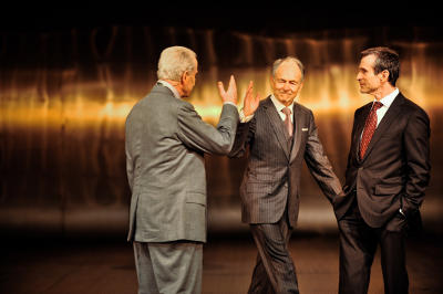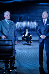 Veiel soll ja dem Vernehmen nach so an die fünfzehnhundert Manuskriptseiten mit Interviews von nicht ganz unwichtigen Leuten, die aus dem Finanzsektor entstammen, im Besitz haben; er hatte sich mit ihnen über vier Jahre je einzeldialogisch ausgetauscht - hatte das Alles jetzt auf 40 Seiten (für sein Stück) gewissermaßen abgeschreckt, ja und herausgekommen ist der vorliegende nicht ganz kurzweilige Abend.
