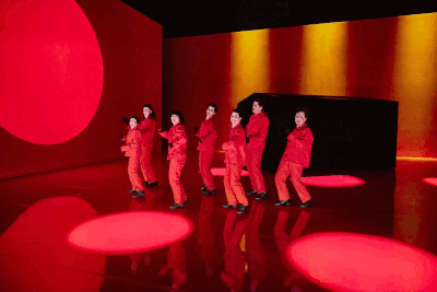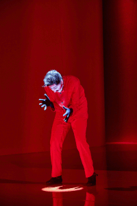 Als sich der samtig rote Theatervorhang öffnet, ist auch die Bühne atmosphärisch in warme Rottöne getaucht. Ein herzschlagähnlicher Rhythmus eines Metronoms erklingt. Auf der ansonsten leeren Bühne bewegt sich ein schwarzer zeltähnlicher Aufbau auf und ab. Wenige Augenblicke später fährt ein auf einem ferngesteuerten Podest platzierter Scheinwerfer (Lichtdesign: Voxi Bärenklau) auf der Bühne hin und her. Der bewegliche Strahler verschafft sich Raum, indem er sich in mehrere Richtungen bewegt. Er strahlt nacheinander Bühnendecke, Publikum und die Bühnenseiten an. Zelt und Strahler kreisen minutenlang umeinander und aneinander vorbei. Erst einige Augenblicke später springen nacheinander sieben Akteure aus dem Zelt hervor.