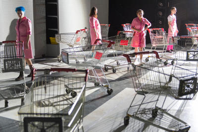 Schon bald gerieren sich die Figuren zur eigentlichen Hauptattraktion des Supermarktes. Dabei glitzert der schöne Schein immer eine Spur zu viel. Als einfältig-naive Daphne lacht Birte Schrein etliche Male völlig enthemmt und bedient sich dabei einer köstlich-quirligen und ausdrucksstarken Mimik. Manuel Zschunke sorgt nicht nur bei seinen interessierten Kolleginnen wiederholt mit aggressiv provokantem Flirtappeal für Spannung. Er beeindruckt auch, wenn er mehrmals durch aneinandergereihte Einkaufswagen hindurchkriecht. Das Warten auf mögliche Kunden verkürzen sich die Akteure durch exzessives Einüben immer abstruserer Situationen. Ursula Grossenbachers Olivia entleert Ketchup, Mayo und Milch auf den Boden. Lena Geyer rollt sich probeweise nach einem möglichen Ausrutschen darüber. Schließlich ist sie auch diejenige, die alles wieder aufwischen darf.